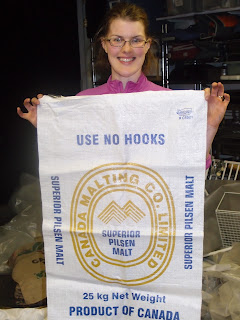 Homebrew stores (like The Cellar up in Greenwood) will usually give away malt bags like the one Erica is holding. They are smaller and a little handier than the burlap sacks and won't decompose on you as quickly. You can find your local store and give them a call to see if they have any on hand.