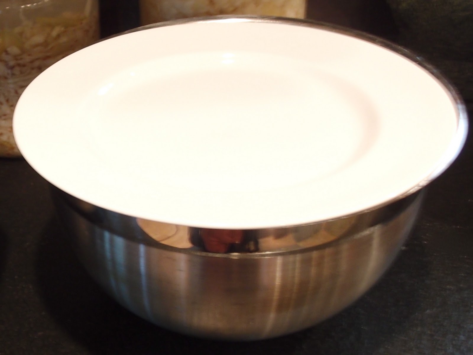 We are fighting the plastic wars here — I have been using plates, saucers and inverted bowls for years, but sometimes find them replaced by wrap — "Your plate was tippy and it was in my way" — so I have been collecting glass saucepan lids from thrift stores. I prefer the ones with the metal handles. Fifty cents apiece, and you can always find the one that fits the bowl you're using.