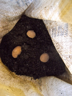 We shook everything up really well. I looked like I was shake-and-baking the worlds heaviest chicken during this part. It was quite the workout. When the bone meal was thoroughly blended into the soil, we added between 3 and 6 potatoes to each bag depending on the size of the potato – the fingerlings were smaller.
