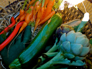 Apples, cherry tomatoes and a few Early Girls, cucumbers, peppers (just 1 so far!), celery, crookneck squash, basil, parsley, lemons, a few oranges left on the tree. Gone already are sugar snap peas, radishes, lettuces, broccoli.