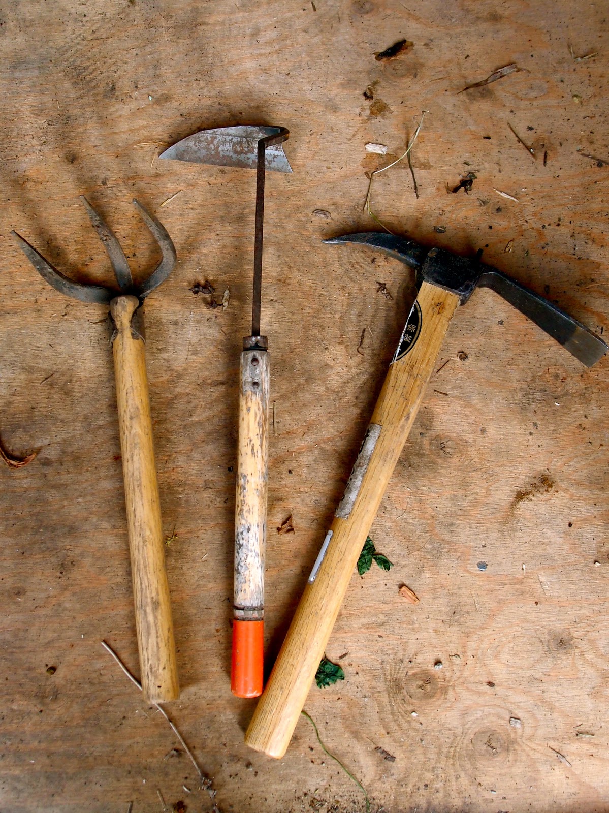 Pictured above are my absolute favorites: a handheld three-tined digging fork, a nejiri garden hoe, and a handheld pick-mattock.