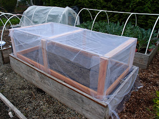 My first attempt this year to thwart the Carrot Fly seemed promising: fine mesh fabric, draped over wire hoops and secured with clothespins and a tight rope around the mesh which dangling to the bottom of the raised bed.